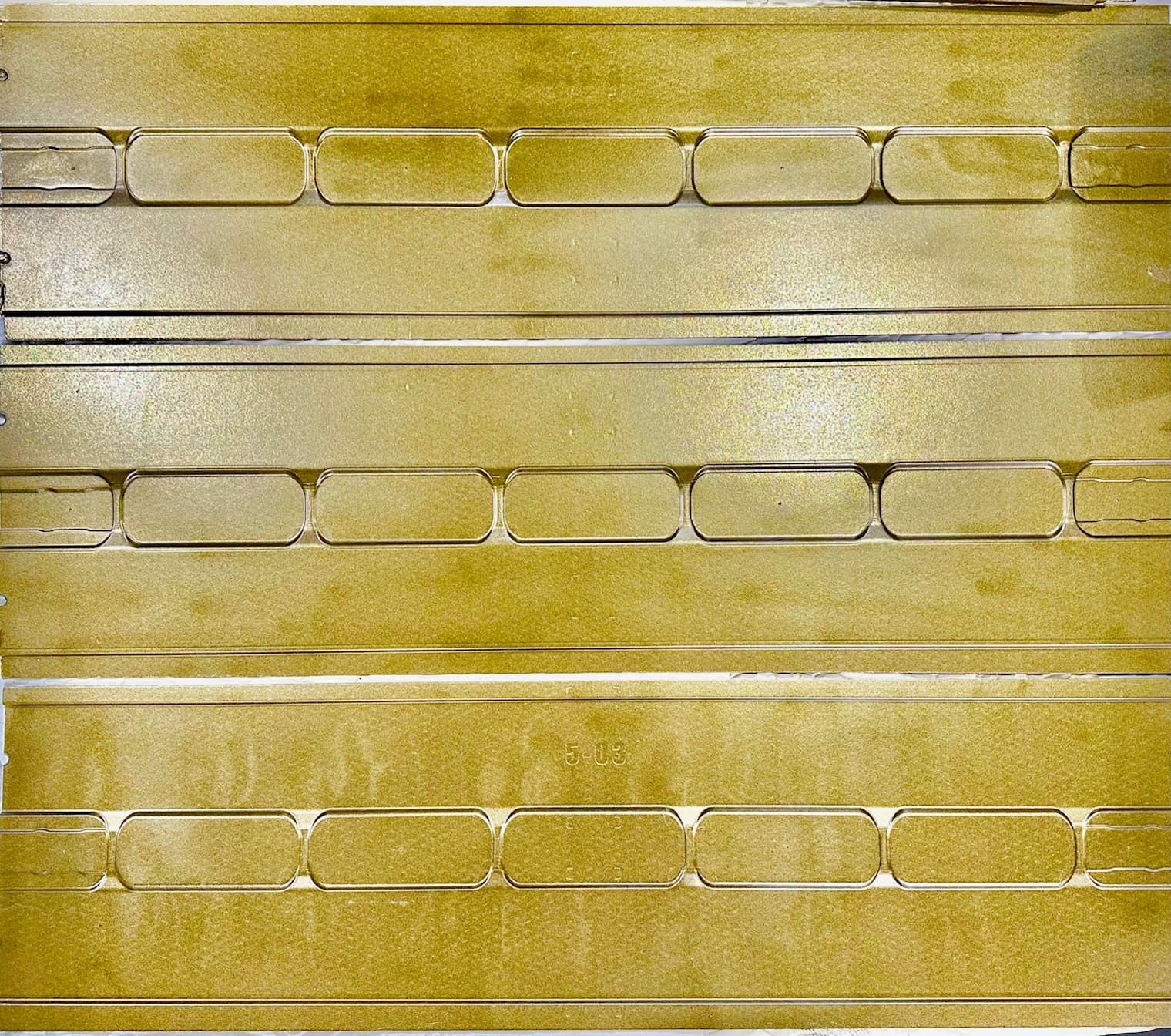 CFRP成形用の適切なサイズと材料構成を実現するため、500mm角・20t対応の平板用プレス金型を製作しました。UD材とチョップ材の組み合わせなど、製品に合わせた多様なプリプレグ成形が可能になりました。